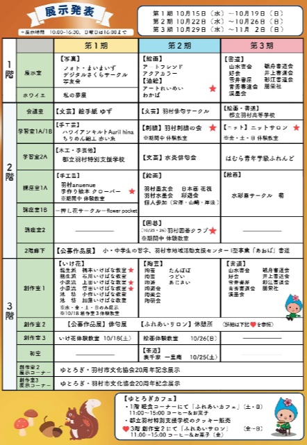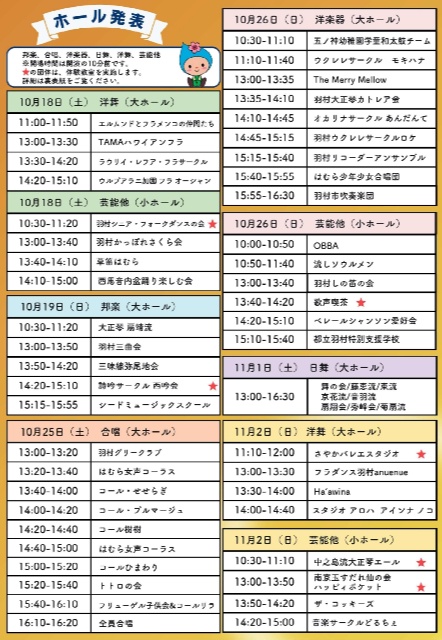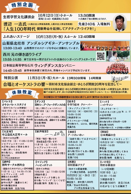 羽村市文化祭、美術・工芸展、みぢかな一歩展、初めの一歩体験教室、サロンコンサート、ふれあいステージ、ホール発表(舞踊、洋舞、洋楽、邦楽、芸能)、研修会、サークル団体紹介